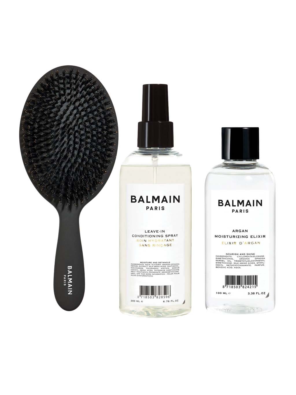 Kompletní péče a styling pro vlasy zahrnující Leave-in Conditioning Spray, Argan Moisturizing Elixir a All Purpose Spa Brush. Set usnadňuje rozčesávání, chrání vlasy před poškozením vnějšími vlivy, dodává lesk, hydrataci a poddajnost.