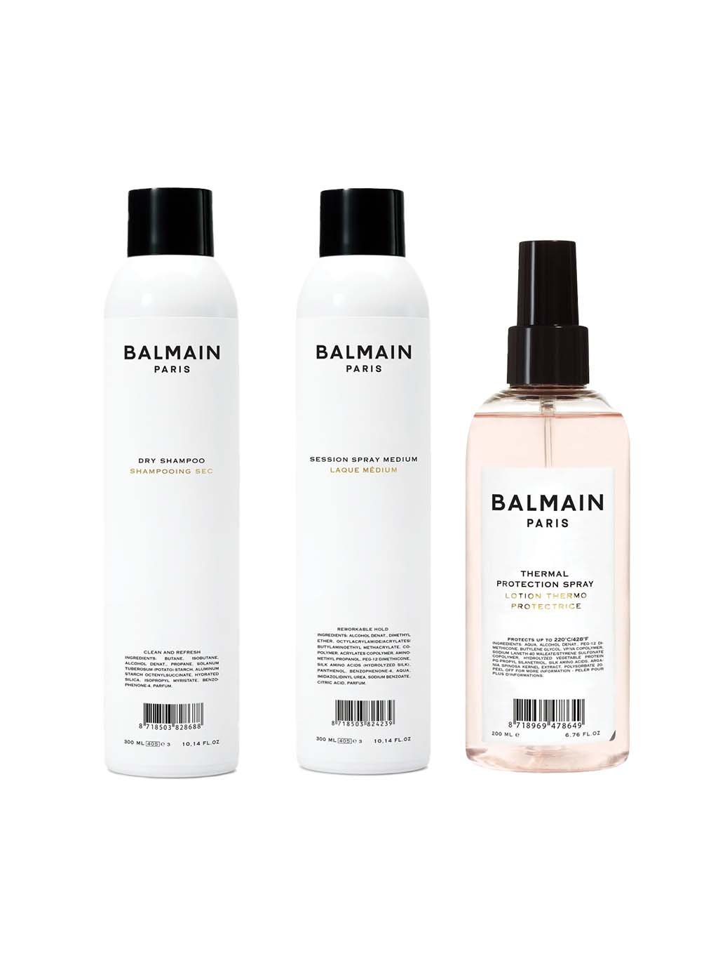 Kompletní péče a styling pro vlasy zahrnující Dry Shampoo, Thermal Protection Spray a Session Spray Medium. Set okamžitě osvěží vlasy, chrání je před horkem a zajišťuje pružnou fixaci účesu s UV ochranou a odolností proti vlhkosti.